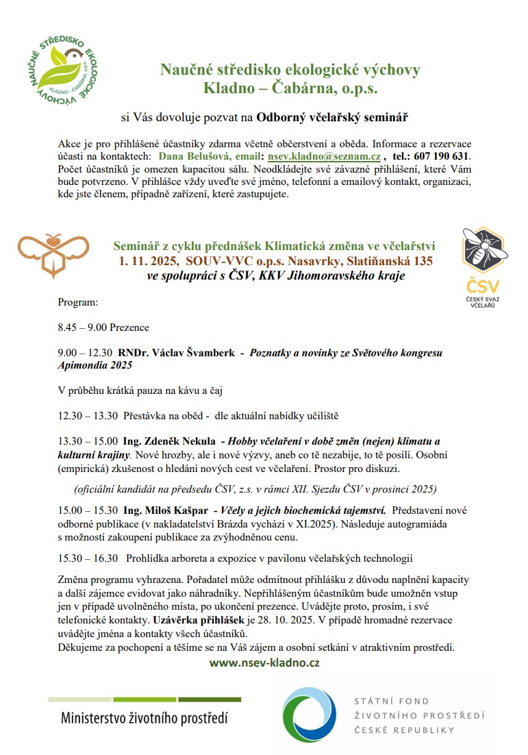 dovoluji si Vás pozvat na semináře (pozvánka v příloze) určené především pro funkcionáře, školitele, přednášející odborníky, vedoucí včelařských kroužků, lektory a včelaře, kteří jsou ochotni se o získané informace podělit i s dalšími včelaři.