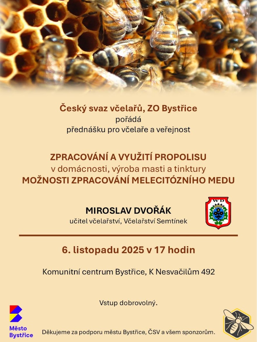 dovolujeme si Vás pozvat na Přednášku o zpracování a využití propolisu, možnosti zpracování melecitózního medu, která se bude konat 6. listopadu 2025.S přáním příjemného dne, Dagmar Maierová ČSV ZO Bystřice